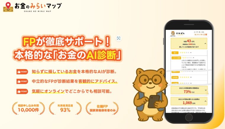 普段は仕事も忙しく、お金や運用についてゆっくり調べたりすることが出来ずに、ついつい後回しにしていました。「お金のみらいマップ」のFPさんは経験豊富で、NISA・iDeCo・保険・不動産など、幅広い運用に関してわかりやすく説明していただけました。商品を売りつけられることがないので、どこに相談したらよいかわからない、という人におススメのサービスです。