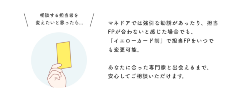 マネドアでは、途中でも担当FPを変更できる「イエローカード制度」があります。
